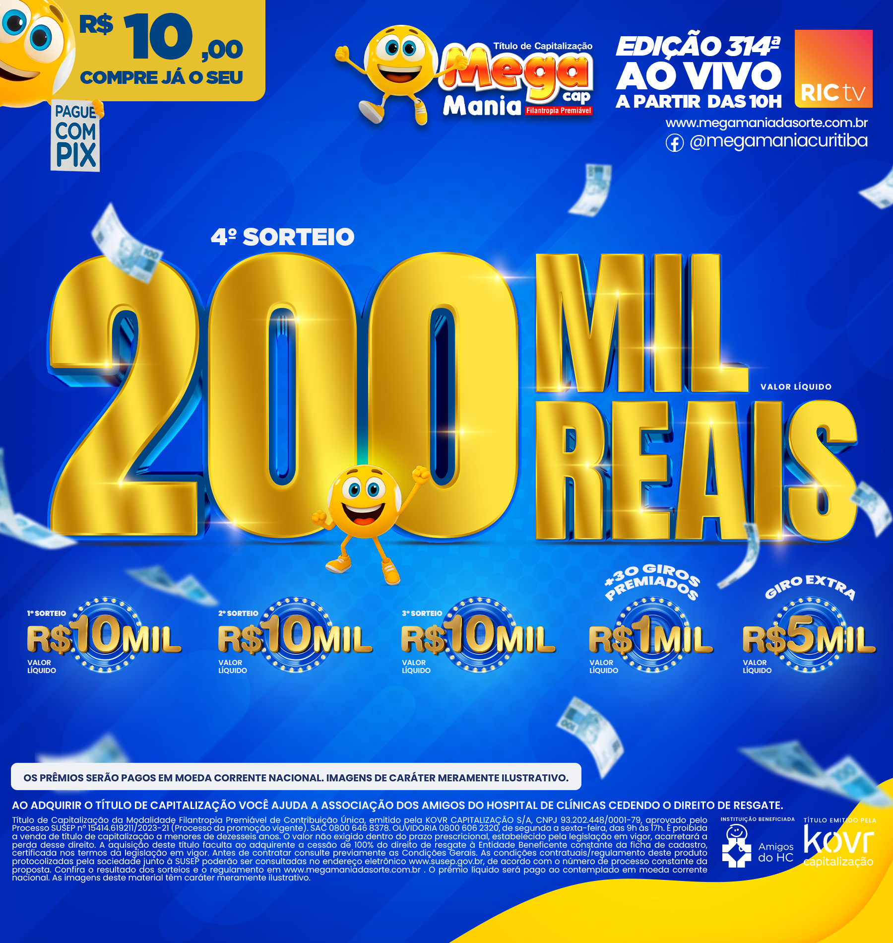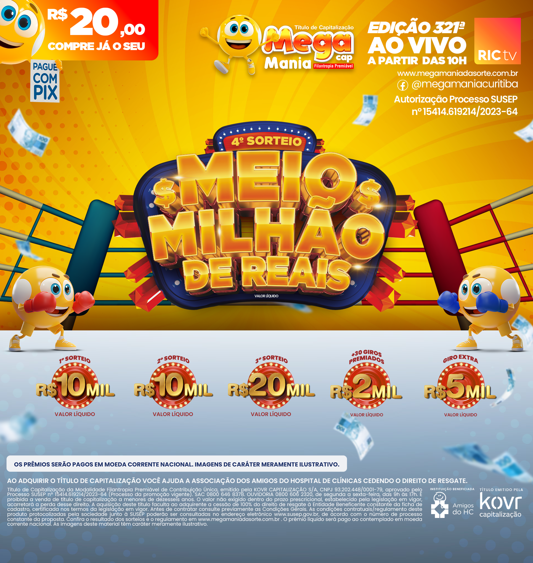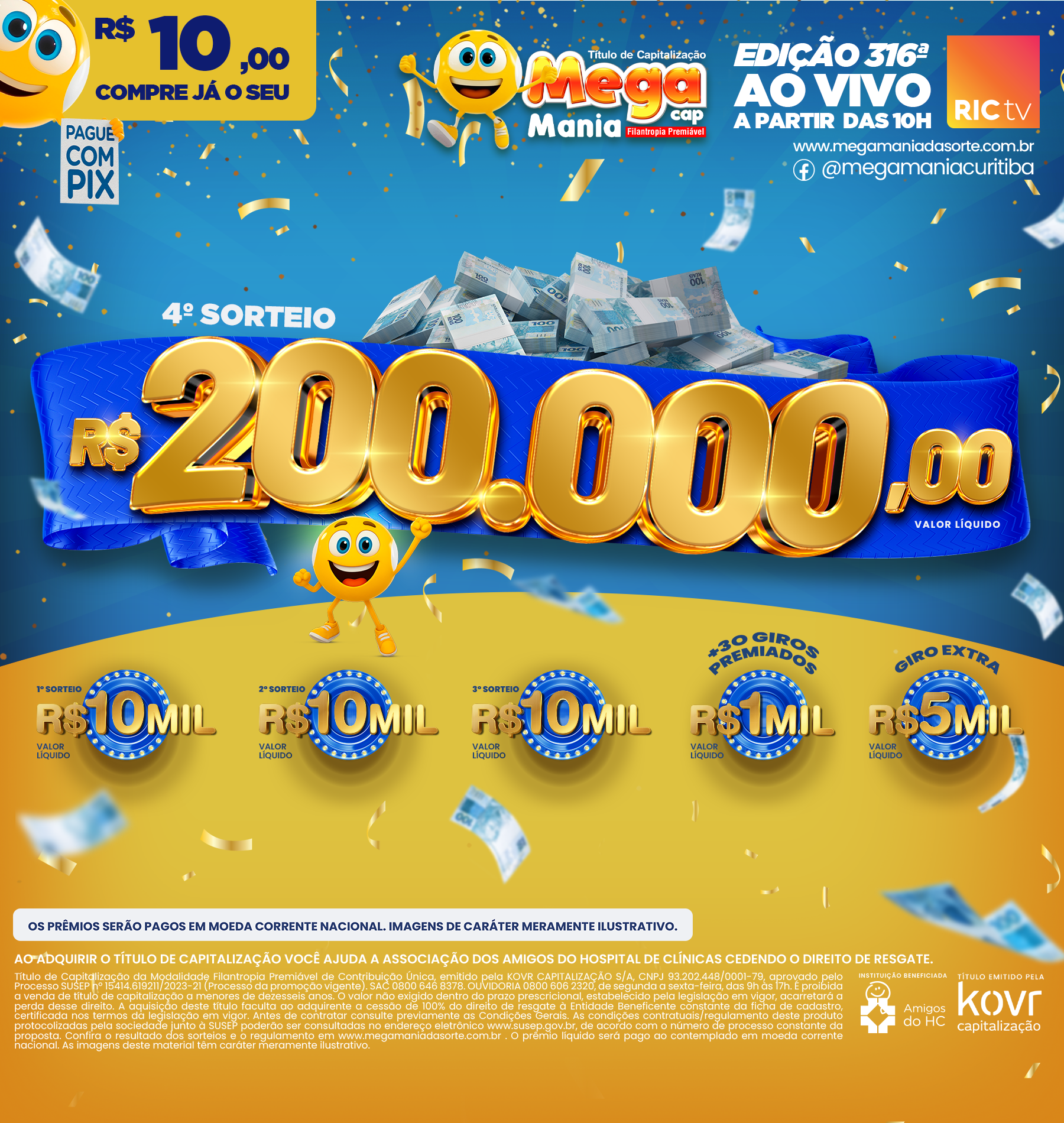 Sorteios decorrentes de Títulos de Capitalização de Pagamento Único, da Modalidade Filantropia Premiável, emitidos pela KOVR Capitalização. Você pode ajudar a associação dos amigos do hospital de clínicas comprando o Megamania Cap e cedendo o direito de resgate. A aprovação deste Título pela SUSEP não implica, por parte da Autarquia, em incentivo ou recomendação a sua aquisição, representando exclusivamente, sua adequação às normas em vigor. Antes de contratar, consulte previamente as Condições Gerais.